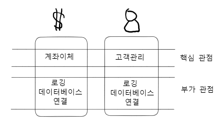 예를 들어 계좌 이체, 고객 관리하는 프로그램이 있을 때 각 프로그램에는 로깅 로직, 즉, 지금까지 벌어진 일을 기록하기 위한 로직과 여러 데이터를 관리하기 위한 데이터베이스 연결 로직이 포함 된다. 이때 핵심 관점은 계좌 이체, 고객 관리 로직이고, 부가 관점은 로깅, 데이터베이스 연결 로직이다. 실제 프로그램의 기능으로 로직을 정리하면 다음 그림과 같다.