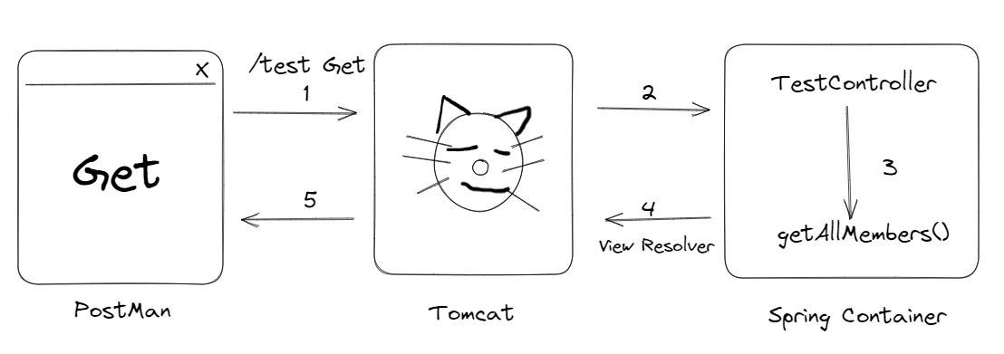 TestController가 /test라는 GET요청을 처리할 수 있는 getAllMembers() 메서드를 가지고 있으므로 전달 받음 - getAllMembers() 메서드와 /test GET 요청 매치, 비즈니스 계층과 퍼시스턴스 계층을 통해 필요한 데이터 수집