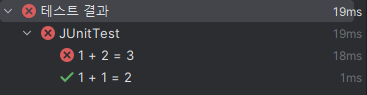 junitTest() 메소드는 성공사례, junitFailedTest는 실패 사례에 대한 테스트 케이스 이다.