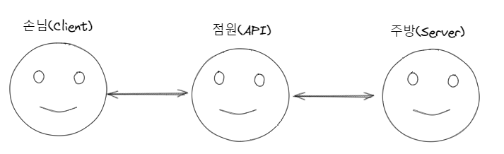 여기서 손님은 클라이언트, 주방에서 일하는 요리사를 서버라고 생각하고, 중간에 있는 점원을 API라고 생각하면 된다.