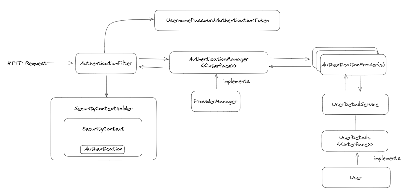 이때 AuthenticationFilter가 넘어온 ID와 PW의 유효성 검사를 하며 유효성 검사가 끝나면 실제 구현체인 UsernamePasswordAuthenticationToken을 만들어 전달한다.