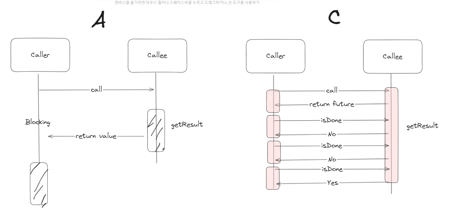 C: getResult 호출한 후, getResult가 완료되지 않더라도 Caller는 본인의 일을 한다. (동기 - Non-Blocking)