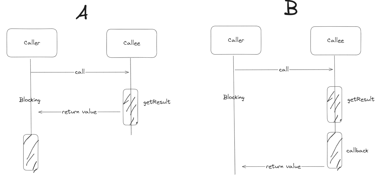 B: Caller는 getResult가 결과를 구하고 callback을 실행하기 전까지 아무것도 할 수 없다. (비동기 - Blocking)